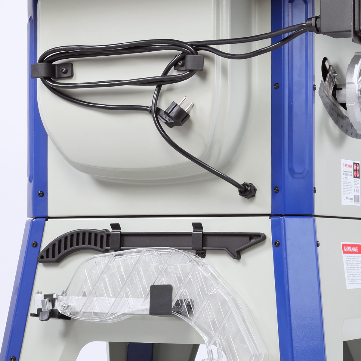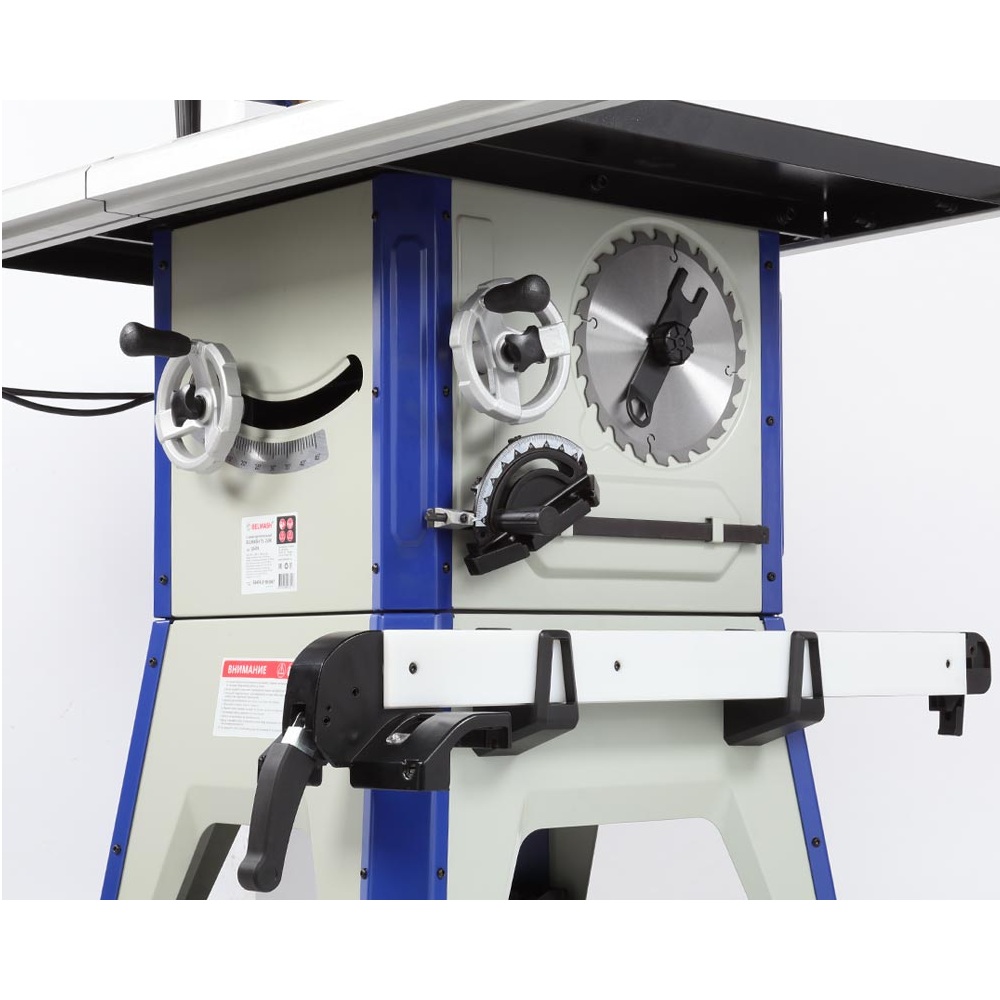 Корпус изделия сварной, закрытый, изготовлен из листовой стали, имеет отверстие для установки патрубка для отвода стружки (Ø 100 мм), снабжен специальными держателями для хранения толкателя, углового упора, параллельного упора, ключа и пильных дисков.