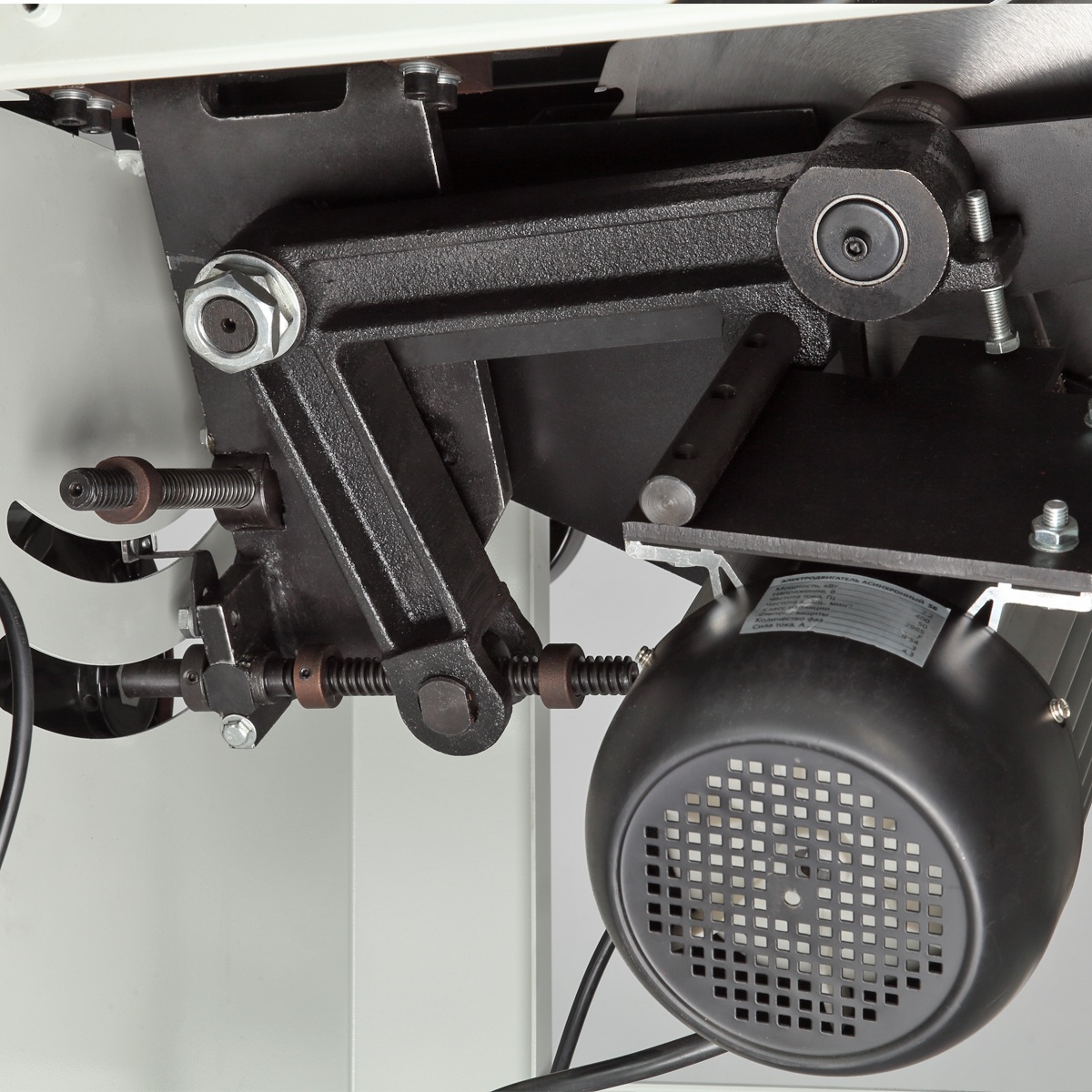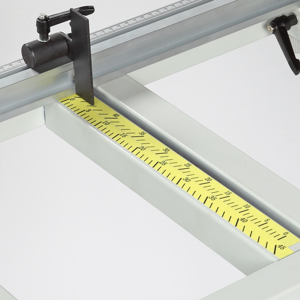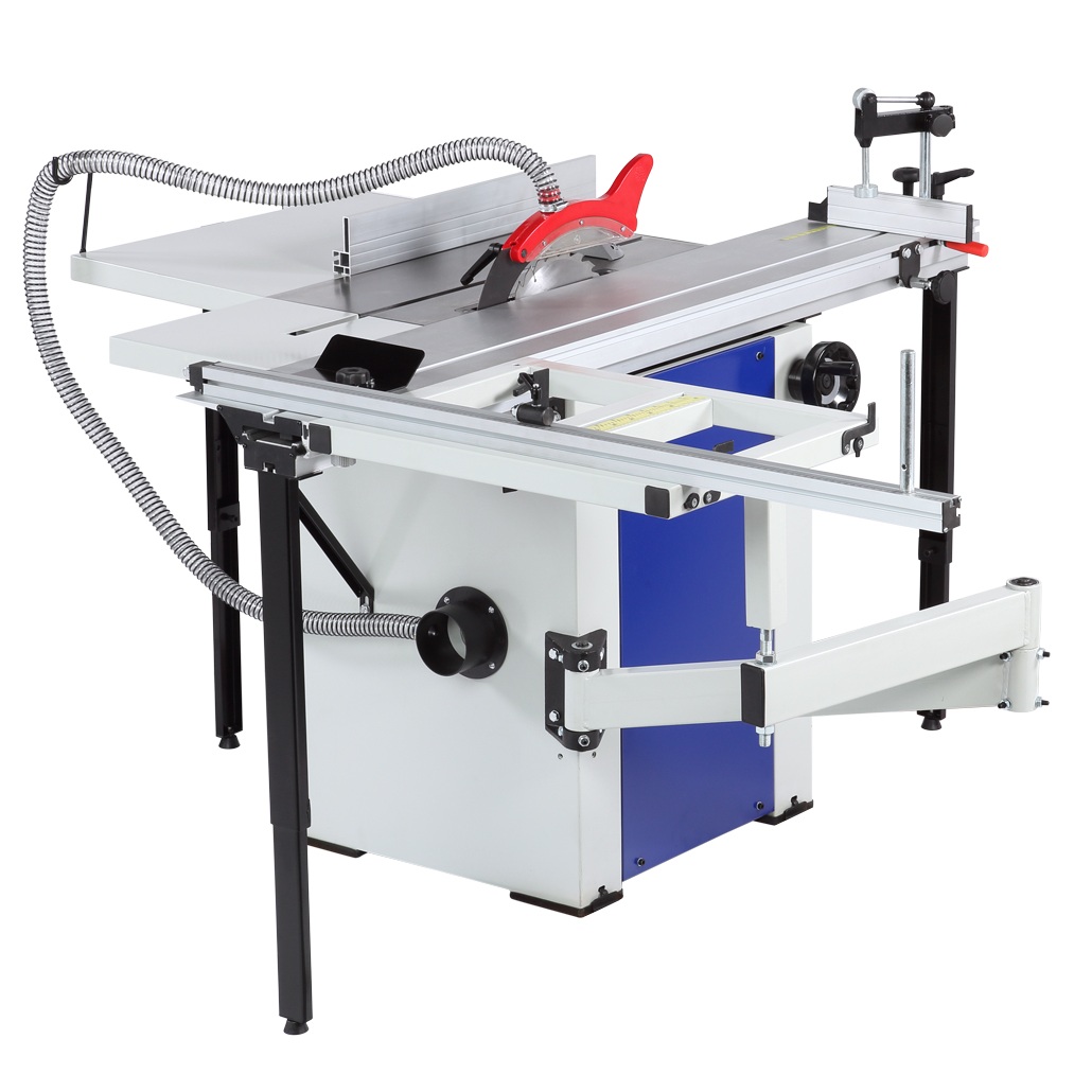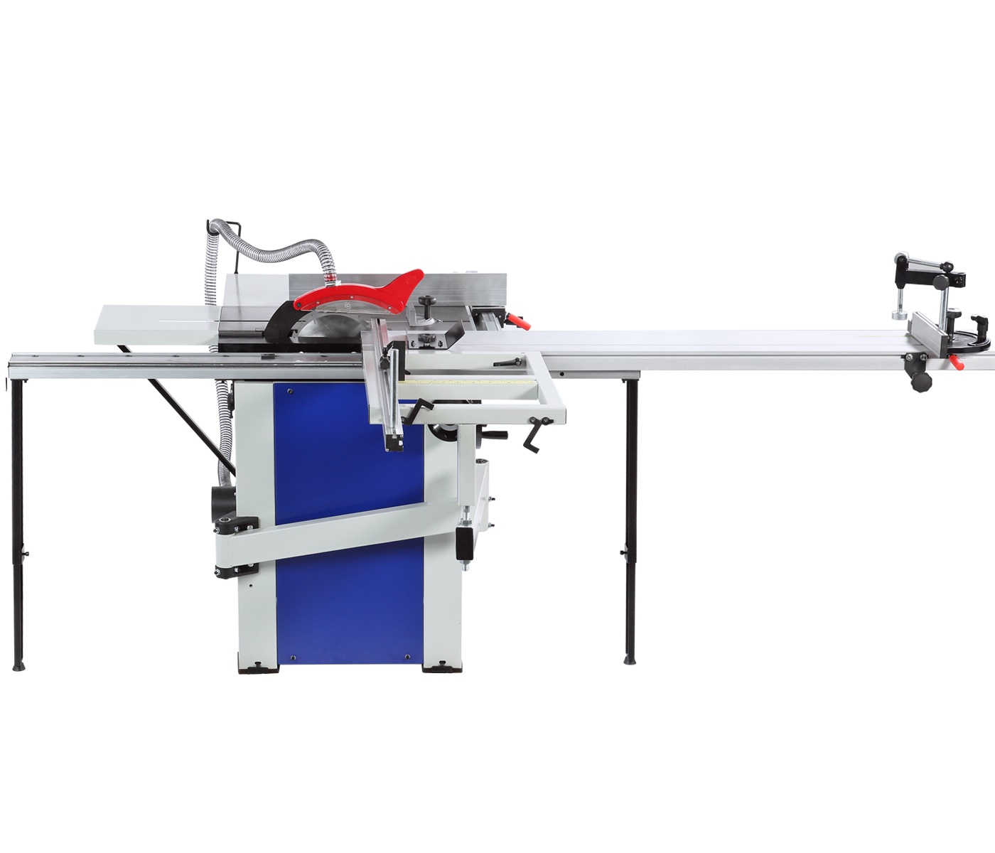 Станок оснащен основным чугунным столом, двумя дополнительными секциями из листовой стали, подвижным столом из алюминиевого профиля и столом поперечного реза из стального профиля. Основной и подвижный столы имеют по одному пазу для установки угловых упоров или дополнительных приспособлений.